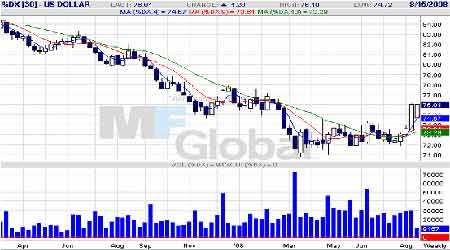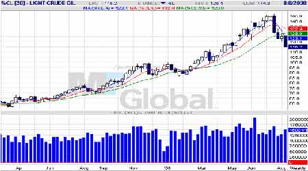 今年,在高油價的影響下,出現了世界性的通貨膨脹,世界上有超過50個國家的CPI已經達到兩位數,全球經濟也受到高油價的打擊而放緩,高油價成了世界高度關注的問題。在這樣的背景下,美國國會、期貨交易管理委員會等機構開始對原油市場進行調查是否存在操縱油價的行為,從而對投機資金形成較大的威懾作用。實際上這種監管已經對市場產生了很大影響,主要表現在基金的凈多單逐漸大幅減少,已經由3月11日的11萬多手凈多單不斷減少,而到8月5日變成了凈空單5550手,原油期貨總持倉由當時的148萬手減到125.5萬手。兩周前為122萬手,資金退出市場明顯。