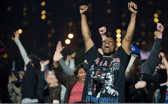 11月4日,在美國費城,美國民主黨總統候選人、伊利諾伊州國會參議員貝拉克·奧巴馬的支持者慶祝奧巴馬的勝利。