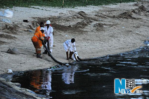 5月25日,新加坡緊急救援人員在新加坡東海岸清理被沖上岸的防止泄漏原油擴散的隔離帶。
