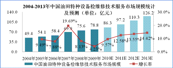 隨著國家對油氣管道和集輸站場安全監督與管理重視程度加強,預計到2013年我國油田特種設備檢維修服務市場將超過126億元,年均復合增長率達12.5%。