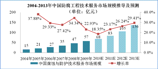 石油開(kāi)采、儲(chǔ)運(yùn),煉油、石化都是腐蝕相當(dāng)嚴(yán)重的行業(yè)。一般情況下,防腐蝕工程量在石油天然氣開(kāi)采運(yùn)輸設(shè)備投入中占30%-40%,化工板塊投入中約占6%左右。以2009年我國(guó)三大石油巨頭的開(kāi)采運(yùn)輸設(shè)備投入79.91億元,化工板塊投入487.11億元來(lái)測(cè)算,國(guó)內(nèi)防腐工程技術(shù)服務(wù)的市場(chǎng)容量為53-62億元。