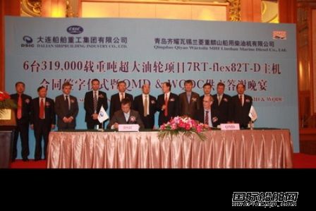 10月25日,青島齊耀瓦錫蘭菱重麟山船用柴油機有限公司(簡稱QMD)和大船重工集團簽訂六臺31.9萬噸油船主機合同。中船重工副總經理董強、副總會計師張英岱,中船重工711所所長金東寒,瓦錫蘭中國有限公司總裁朱炯炯,大船重工集團總經理、黨委書記劉征,副總經理張濤、李程參加了簽字儀式。