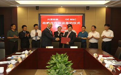 2014年6月25日,江陰興澄特種鋼鐵有限公司與GE檢測控制技術業務在江蘇省江陰市簽署了無損探傷應用及解決方案戰略合作諒解備忘錄。雙方將按照互惠互利、優勢互補、共同發展的原則,結成非排他性的戰略合作伙伴關系。此次備忘錄的簽訂,對促進雙方進一步深化合作具有重大意義。中信泰富特鋼集團副總裁兼江陰興澄特種鋼鐵有限公司總經理錢剛與GE檢測控制技術業務全球總裁Brian Palmer、GE檢測控制技術業務中國總經理許欣、GE檢測控制技術業務檢測科技產品線中國及亞太區總經理王飚先生共同出席了此次活動,顯示出雙方公司對此次合作的重視。