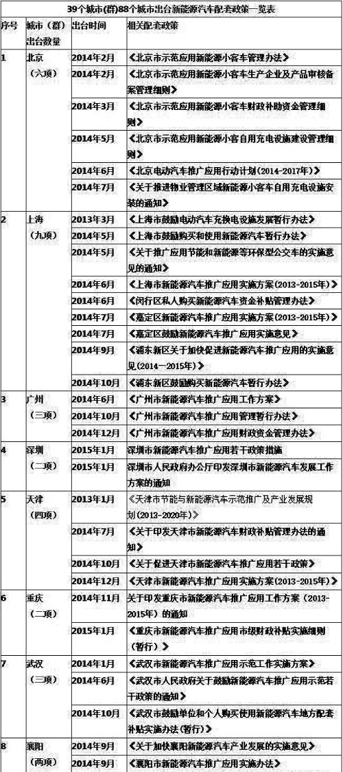 以下為39個城市(群)88個城市新能源汽車配套政策一覽表