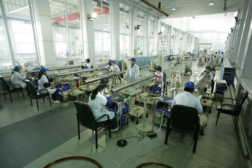 | 1力神員工專心致志組裝電泵定子。 |