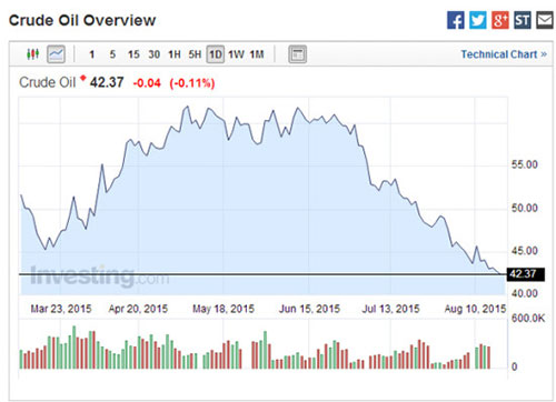 美國WTI9月原油期貨價格下跌1.48%,至41.87美元/桶,創(chuàng)2009年3月份以來新低。布倫特10月原油期貨價格下跌0.9%,至48.74美元/桶,僅比6年最低價高3美元。