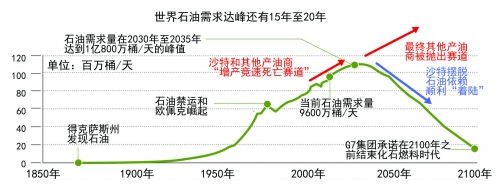 據伯恩斯坦的世界石油消費預測顯示,到2035年左右,全球石油絕對消費量將到達峰值。這意味著,屆時,滿足世界能源新增需求將由石油替代品來承擔。石油在經濟、環境、技術等綜合成本作用下,需求將逐漸下降。這是能源更迭的必然趨勢。而沙特提出的“2030轉型愿景”與石油消費達峰趨勢幾乎不謀而合。這表明,海灣產油國正在抓住石油緩慢增長的最后20多年,應對石油式微的能源新格局。換句話說,石油在世界能源消費結構中的穩中趨降,這一根本轉變推動了產油國逐漸弱化石油經濟支柱的選擇。