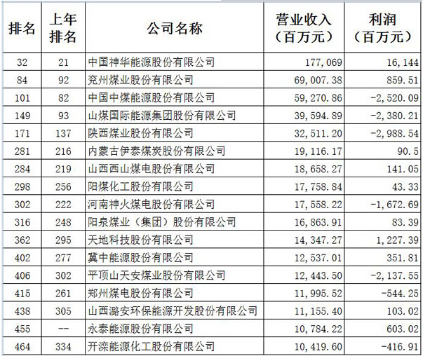 煤炭行業(yè)有17家公司上榜。除兗州煤業(yè)外,其余上榜的煤炭企業(yè)排名較去年均有所下滑,其中7家公司虧損。其中,中國(guó)神華繼續(xù)排名第一,位次較上年下降11位,排名第32;兗州煤業(yè)排名第二,位次較上年上升8位,排名第84。永泰能源股份有限公司首次入選。