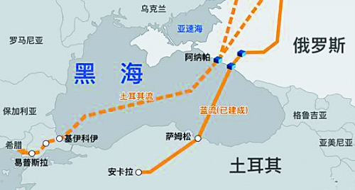 “土耳其流”管道將建設(shè)兩條經(jīng)黑海海底至土耳其的管道,一條向土國(guó)內(nèi)供氣,另一條計(jì)劃經(jīng)土境內(nèi)向南歐供氣。