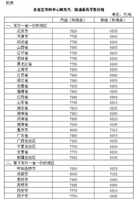 附:各省區(qū)市和中心城市汽、柴油最高零售價格