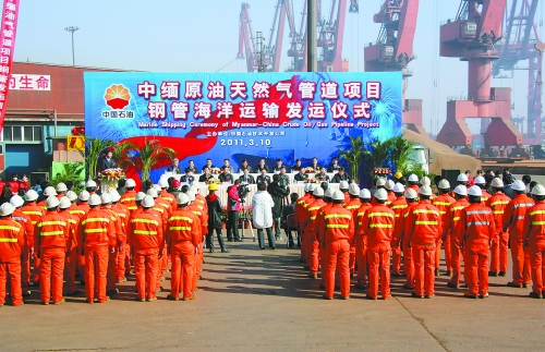 3月10日,中國(guó)石油技術(shù)開(kāi)發(fā)公司向中緬原油天然氣管道項(xiàng)目供應(yīng)的鋼管,在天津港務(wù)局五公司東突堤碼頭通過(guò)海洋運(yùn)輸正式發(fā)運(yùn)。