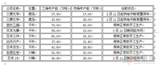 同樣,日本丙烯出口也將受到較為嚴重的影響。以下為廠家生產情況統計:
