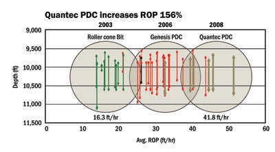 This graph shows drill bit history in the challenging Granite Wash of the Texas Panhandle. Roller cone bits in 2003 averaged about 16 ft/hr (4.8 m/hr). Hughes Christensen’s Genesis PDC was the first PDC bit to consistently drill the section at nearly double this ROP, averaging 30+ ft/hr (9.2+ m/hr). The Quantec line has taken this performance to the next level with ROP averaging nearly 42 ft/hr (13 m/hr) or 156% faster than the roller cone average. (Image courtesy of Hughes Christensen)