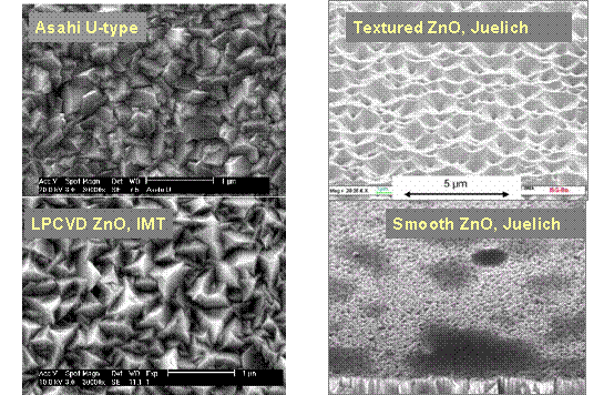 當前采用具有一定絨度的TCO薄膜是提高薄膜硅太陽能電池效率的有效途徑,這是因為入射光線在TCO絨面或背反射電極處被散射,由于散射光在薄膜中具有更長的光程,因此被吸收的幾率更大。目前大規模商業化的TCO是使用常壓化學氣相沉積摻氟的SnO2(FTO)。Oerlikon公司采用低壓化學氣相沉積(LPCVD)摻硼的ZnO,由于制備的TCO表面具有一定的絨度,可直接用在電池上。Meier 等人通過優化LPCVD沉積工藝參數獲得的ZnO:B整體性能優于FTO ,在此基礎上獲得單結非晶硅薄膜太陽能電池的穩定效率達到9.1%。但是目前國際上研究的熱點是利用磁控濺射技術沉積摻Al的ZnO(AZO),由于薄膜的主體Zn、A1在自然界中的儲量豐富,生產成本低,具有價格優勢;而且AZO具有FTO薄膜無法相比的優越性:無毒、氫等離子中的穩定性高、制備技術簡單、易于實現摻雜等;最重要的是AZO在光、電特性方面可滿足當今商用FTO薄膜的一切指標。使用濺射技術沉積的AZO表面光滑,但是通過稀HCl溶液腐蝕后可獲得具有優異陷光能力的表面。圖2為典型的在AZO織構表面與光滑表面上獲得的電池量子效率圖,可看到在織構的表面上將獲得更大的電流密度。圖3為使用三種制備TCO技術獲得的TCO表面形貌圖。目前大面積濺射AZO還處于研發階段,主要的研究方向是提高大面積濺射的均勻性與提高靶材的利用率。2001年,Muller等人在AZO上獲得了a-Si電池的初始轉換效率為9.2%(32×40 cm2);2003年Muller等人獲得a-Si電池的初始轉換效率為9.2%(60×100 cm2)。在a-Si/µc-Si疊層電池的方面,2001年,O.Kluth等制備電池的初始轉換效率為12.1%(1cm2);2004年,Hüpkes等制備電池的初始轉換效率為9.7%(64cm2);2008年,Tohsophon等制備的電池在不同面積下的轉換效率分別為10.7%(64cm2)和9.6%(26×26cm2)。隨著大面積濺射AZO技術的成熟,未來將會在薄膜硅太陽能電池中占有一席之地。