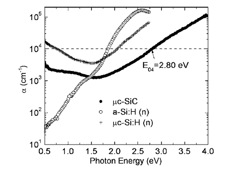 在薄膜硅太陽能電池中,p型和n型的摻雜層被稱為“死區(qū)”,對光生電流沒有貢獻,為了提高電池的效率,應(yīng)盡量降低摻雜層中的光吸收。除了使摻雜層的厚度盡可能降低外,研究人員常使用寬帶隙材料作為窗口層來減少光的吸收。1981年,Tawada等使用a-SiC:H作為a-Si電池的窗口層實現(xiàn)電池的轉(zhuǎn)化效率為7.1%。p型a-SiC:H的光學(xué)帶隙大約為2.0eV,具有優(yōu)良的導(dǎo)電性能與透光率,常用做a-Si薄膜電池的窗口層。Barua等人在a-Si電池中使用p型a-SiO:H作為窗口層也獲得較好的電池效率。由于微晶硅比非晶硅易實現(xiàn)摻雜,p型的微晶硅薄膜具有高的電導(dǎo)率,同時對可見光的吸收系數(shù)遠(yuǎn)小于非晶硅的,被Hattori、Fujikake等人用做a-Si電池的窗口層。在µc-Si薄膜太陽能電池中,本征層對窗口層材料的表面性質(zhì)比較敏感,直接使用a-SiC:H和a-SiO:H作為微晶硅電池的窗口層會導(dǎo)致本征層中有較厚的非晶孵化層。S.Klein、Huang等人使用熱絲化學(xué)氣相沉積技術(shù)在低溫下制備了高電導(dǎo)、高透過率的c-SiC:H材料,霍爾系數(shù)測量發(fā)現(xiàn)c-SiC:H材料顯n型。Huang等人使用c-SiC:H作為窗口層制備了從n面入射的n-i-p型微晶硅薄膜太陽能電池,獲得了26.7mA/cm2的高短路電流與9.2%的電池效率,Huang認(rèn)為高電導(dǎo)、高透過率的窗口層與本征層中高的空穴遷移率是影響電池性能的關(guān)鍵因素。圖6為c-SiC:H的吸收系數(shù),可以看到在高能端,c-SiC:H的吸收系數(shù)遠(yuǎn)小于n型微晶硅和非晶硅的吸收系數(shù)。