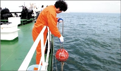 9月2日,國家海洋局監測人員在溢油事故現場取樣核查