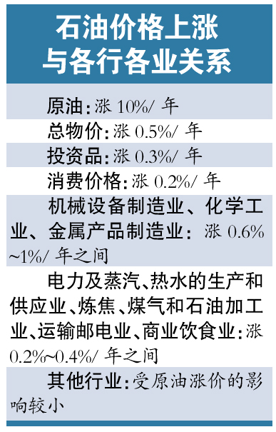 經測算,如果原油價格上漲10%并維持一年,將使總體物價水平上漲0.5%,投資品價格上漲0.3%,消費價格上漲0.2%。