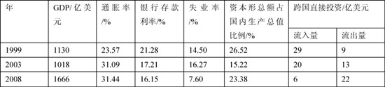 原始數(shù)據(jù)采自世界銀行《世界發(fā)展指標(biāo)》唯跨國直接投資采自聯(lián)合國貿(mào)易與發(fā)展委員會(huì),筆者編表;表內(nèi)GDP以2000年不變美元值計(jì)算,通脹率按消費(fèi)者價(jià)格計(jì)算。