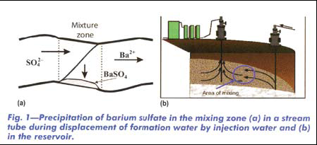 對于生產井的地層損害而言,硫酸鋇沉淀是其主要物理機理。通常海上油田注水水源是海水,海水中富含陰離子。如果地層水包含陽離子,經混合注入后,地層水會出現硫酸鋇沉淀(見圖1)。同樣反應發生于硫酸鹽陰離子和鍶、鈣或其它金屬陽離子之間。地層水與海水的混合區域內易發生硫酸鹽沉淀。注水時在注水井到生產井井底地間之間所形成的混合區域持續向生產井方向移動(即當混合區域經過井網時,其在很短時間內會在油藏井網內形成聚集(Fig.1b);旌蠀^域移動所形成的沉淀就地層孔隙空間而言,僅占一小部分,并不能降低地層滲透率。地層水/海水持續混流至生產井區域,而生產井所產出液中包括來自高滲透地層的注入水和來自