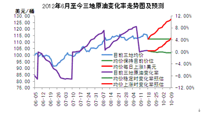 三地變化率預(yù)測(cè):11日調(diào)價(jià)之后,三地變化率仍保持上漲走勢(shì)。但近兩日國(guó)際油價(jià)的大幅下跌使得變化率走勢(shì)出現(xiàn)震蕩。卓創(chuàng)數(shù)據(jù)粗略預(yù)算,如果三地均價(jià)每日漲幅至少在1美元/桶,則至10月9日(國(guó)際),即22個(gè)工作日滿(mǎn)足之時(shí),三地均價(jià)持續(xù)漲幅將達(dá)15美元/桶的情況下,三地變化率會(huì)再次漲破4%。但如若國(guó)際油價(jià)保持震蕩走勢(shì),22個(gè)工作期滿(mǎn)之時(shí),三地變化率將難以達(dá)到±4%的條件。