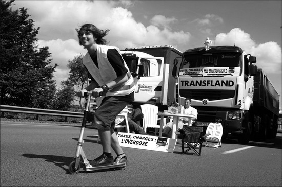 圖:汽車沒有滑板快:6月30日,法國北部的法朗潘,大批卡車司機以堵塞道路的方式抗議油價上漲,一名少年蹬著滑板車從堵塞公路的卡車旁經過