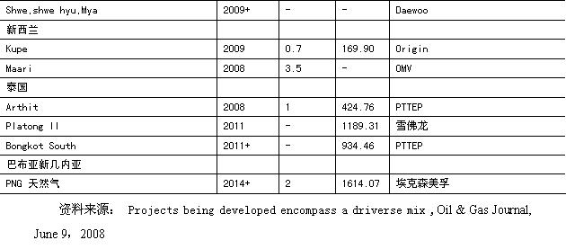亞太地區是全球六大能源中心之一,包括有澳大利亞、文萊、中國、印度、印度尼西亞、馬來西亞、泰國、越南、孟加拉、巴基斯坦、緬甸、巴布亞新幾內亞等13個重要油氣生產國,其中中國是該地區最大的能源生產國和消費國。2007年亞太地區探明石油儲量343億桶,占世界的2.6%;天然氣儲量117626億立方米,占世界的6.7%;原油產量791萬桶/日,占世界的9.7%,消費量2544萬桶/日,占世界30.0%;天然氣產量3915億立方米/年,占世界的13.3%,消費量4478億立方米/年,占世界的15.3%。鑒于該地區能源消費增長較快,近年來,許多國家都紛紛提出了一些可能上馬的新的能源項目,目標是確保本國能享有穩定可靠、經濟上能夠承受、對環境友好并且數量適當的商業性能源供應。美國《油氣雜志》調查,2008-2015年,亞太地區將有57個油氣投資項目投產,其中重要的為幾個計劃和正在建設的液化天然氣項目(附表)。