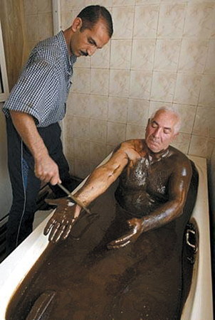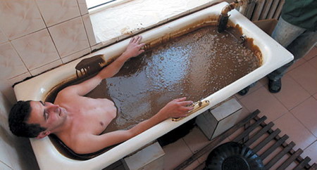 躺進這焦糖色石油的浴盆后,Mutukhov感覺全身被敷上了厚膜。浴盆內的溫度維持在攝氏40度左右,幾分鐘后額頭就開始冒汗。泡足時間后,要清洗可不是一件簡單的事情。如果用吸油紙慢慢檫,怎么也得花上幾個小時,但療養院的人卻另有妙招,待客人洗浴完后以專用的刮刀刮掉身上的石油。之后再用紙質毛巾替浴者擦凈,并長時間仔細地淋浴,將身上的油完全洗干凈。