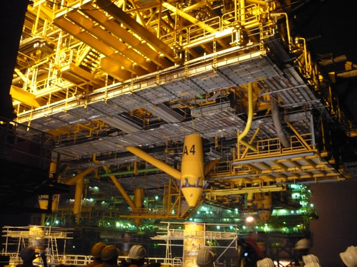 當地時間19日下午4點40分,重2541噸的組塊從駁船上吊起,長波涌使得“藍鯨”船頭上下起伏一米多,組塊插尖幾次插入導管腿又跳出來,經過數次嘗試,直至晚上11點41分組塊才被安全吊放到導管架上。業主對此次吊裝表示滿意。