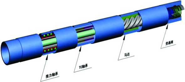 導向鉆井系統用螺桿鉆具 導向鉆井系統所用井下馬達主要有帶襯墊的彎外殼螺桿鉆具、雙傾萬向螺桿(DTU)等,這些馬達與隨鉆測量系統(MWD)、聚晶金剛石鉆頭配合在一起,進行長時間地鉆井并實時收集井下情況,保證井眼沿設計軌道鉆到目的層。Anadrill公司研制的地面可調彎殼體螺桿鉆具壽命長達1000h。