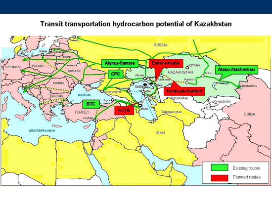 自十九世紀末阿塞拜疆巴庫油田發現以來,由巴庫油田通往黑海、向北通往俄羅斯的輸油管線成為歐洲的一條經濟命脈,里海及高加索地區隨即成為國際戰略爭奪的熱點。隨著里海地區石油天然氣探明儲量的不斷增加,油氣產量的快速增長,為控制里海地區油氣輸送權而展開的競爭愈演愈烈。特別是近十年來,以美國為首的西方國家、俄羅斯、里海周邊國家及國際石油公司,一方面擴建和改建已有的輸油管線以增強其輸送能力,另一方面出于各自的利益需要,積極開展新管線建設的外交準備、開展可行性研究,提出一系列新輸油管線建設方案,從而試圖打破俄羅斯對該地區油氣輸送的獨霸權,使輸送管線逐漸呈現復雜多樣的分布格局,中-哈跨國輸油管道投產后向東方的輸油量將取代西部出口管線,占據第一位。這對里海區域的大型石油項目將產生深遠影響。