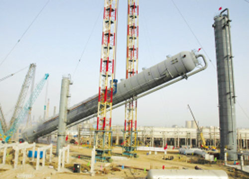國家重點建設項目、天津石化100萬噸/年乙烯及配套工程建設工地再傳捷報。昨天,中國石化集團第四建設公司采用自有國際領先、國內唯一通過國家認證的2500噸級門式液壓吊裝系統與700噸履帶式起重機聯合吊裝起天津100萬噸/年乙烯及配套工程乙烯裝置第二丙烯精餾塔,并安全平穩一次就位成功。