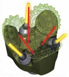 Fig. 5 . The new roller cone technology from Smith Bits incorporates three vectored extended nozzles and three dome-jet inner nozzles to apply maximum hydraulic energy to the hole-bottom-enhancing cuttings removal, ultimately increasing penetration rates.