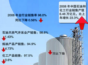 中國石油和化學(xué)工業(yè)協(xié)會分析報告顯示,2008年中國石油和化工行業(yè)銷售產(chǎn)值6.46萬億元,比上年增長23.3%。