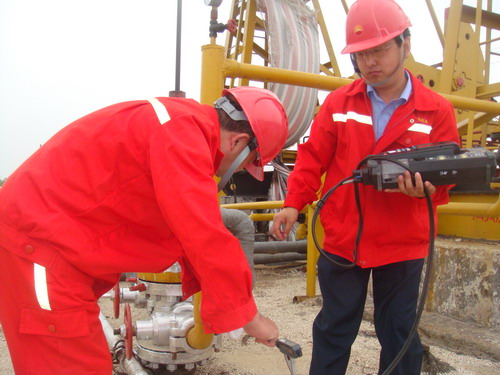 圖② 技術專家在用高精密檢測儀測量套管中的氧氣含量。