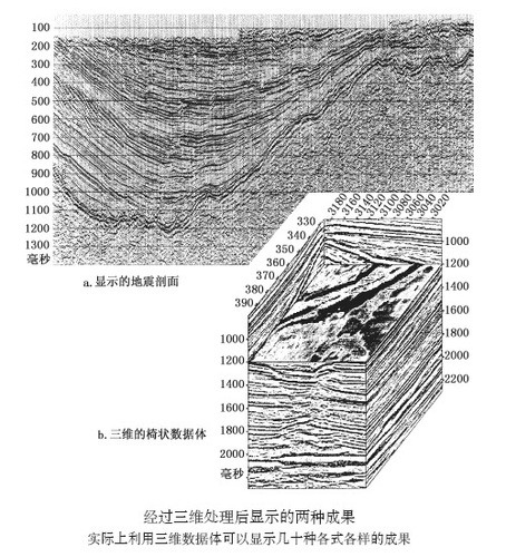 與二維地震勘探相比,三維地震勘探不僅能獲得一張張地震剖面圖,還能獲得一個三維空間上的數(shù)據(jù)體。三維數(shù)據(jù)體的信息點的密度可達12.5米×12.5米(即在12.5米×12.5米的面積內(nèi)便采集一個數(shù)據(jù)),而二維測線信息點的密度一般最高為1千米×1千米。由于三維地震勘探獲得信息量豐富,地震剖面分辨率高,地下的古河流、古湖泊、古高山、古喀斯特地貌、斷層等均可直接或間接反映出來。地質(zhì)勘探人員利用高品質(zhì)的三維地震資料找油找氣,中國近期發(fā)現(xiàn)的渤海灣南堡大油田、四川普光大氣田、塔里木盆地塔中Ⅰ號大氣田等,全要歸功于高精度的三維地震勘探技術(shù)。