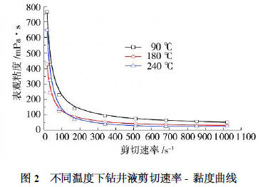 從圖2 可以看出:剪切速率對鉆井液黏度影響較大;隨著剪切速率的升高,不同溫度下鉆井液的黏度總體上均呈降低趨勢;在超高溫條件下,當剪切速率超過300 s - 1 時,曲線趨于平穩,即鉆井液的黏度基本上穩定,且表觀黏度大于20 mPa ·s。國內外