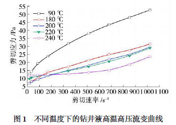 從圖1 可以看出:在低剪切速率下,當溫度升至180 ℃時,剪切應力逐漸降低; 當溫度大于180 ℃時,剪切應力隨溫度的升高而增大; 在高剪切速率下,溫度升至240 ℃時,剪切應力逐漸減小。從流變曲線上來看,當溫度低于180 ℃時,抗高溫鉆井液屬于典型的假塑性流體,當溫度高于200 ℃時,鉆井液的流型屬于含有一定屈服值的脹流型。