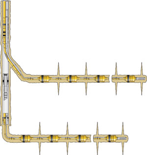 This particular well was drilled on a pad that also had an offsetting single-lateral well that needed stimulation. Therefore, the plan was to stimulate the bottom lateral of the ML and then rig over and stimulate the single-lateral well. While that well was being treated, the diverters on the ML were switched simultaneously. Once the single-lateral offset well was completed, the pumping crews would switch back to treat the upper lateral of the ML. This saved the operator mobilizing charges for the pumping crews and maximized potential savings on all three laterals, which were stimulated in the course of one week. Both laterals were completed using five-stage openhole packer systems (Figure 1). Both laterals are now open and producing.