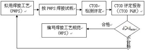 一般做法如下:先確定擬采用的焊接工藝PWPS(Preliminary Welding Procedure Specification),然后按PWPS焊接CTOD試板,制成試樣后,進行CTOD檢測評定。如檢測評定結果合格,擬用焊接工藝PWPS就成為正式焊接工藝規范WPS(Welding Procedure Specification);如評定結果不合格,就要修訂PWPS,再進行新一輪CTOD檢測評定。PWPS的合格與否,是將檢測得到的CTOD特征值δ與規定的焊接接頭CTOD允許值δmin進行比較,若δ≥δmin為合格,否則就不合格。