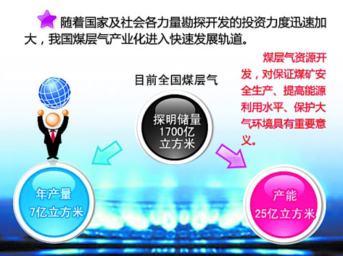 隨著國家及社會各力量勘探開發的投資力度迅速加大,我國煤層氣產業化進入快速發展軌道。目前,全國煤層氣年產量達7億立方米。