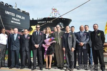 4月7日,新時代公司碼頭上彩旗招展,鮮花綻放,4#163000噸原油輪身著盛裝,等待著圣母使命名。下午三點,希臘船東率領三十多位嘉賓,在公司總經理劉海金的陪同下走入命名現場。 命名儀式由常務副總張玉永主持,劉海金總經理、希臘船東先后致辭。在歡悅的氣氛中,圣母將4#163000噸原油輪命名為“MOUNT FUJI”。隨后,船東一行登上新船,剪彩、祈禱并參觀。公司副總經理陳學亮、于剛出席了命名儀式。
