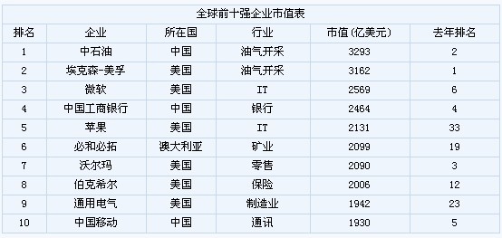 英國《金融時報》30日發(fā)布了全球五百強企業(yè)排名,中石油首次超過美國埃克森石油公司,成為全球市值最大的企業(yè),前10強中國企業(yè)有三個。