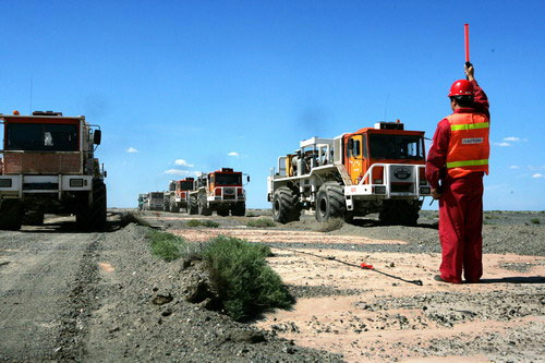 物探隊伍在三塘湖地區進行地震采集作業。
