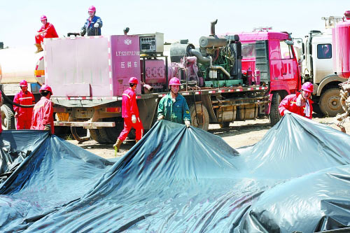 圖:施工隊員在各個管線連接點下鋪上塑料布和毛氈,防止液體大面積滲漏地面,造成環境污染。