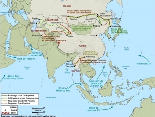 文章指出,中國(guó)為其能源戰(zhàn)略還發(fā)展陸路輸油管道,這樣可以避免敏感的海陸運(yùn)輸。2008年,超過(guò)8成運(yùn)往中國(guó)的石油途徑馬六甲海峽。為此,中國(guó)早在2006年就開(kāi)始設(shè)計(jì)原油管道計(jì)劃,以完成哈薩克斯坦輸往中國(guó)每日20萬(wàn)桶的石油供應(yīng)量,目前該管道已投入運(yùn)營(yíng)。新的工程將使日輸油量增加到40萬(wàn)桶。另外,中國(guó)大慶至西伯利亞日輸油量達(dá)30萬(wàn)桶的輸油管道工程已于2009年5月開(kāi)工。為提高能源戰(zhàn)略的安全性,中國(guó)打算繞過(guò)馬六甲海峽,從緬甸到中國(guó)昆明建造陸路輸油管道線(xiàn)路,目前該計(jì)劃已提上日程。