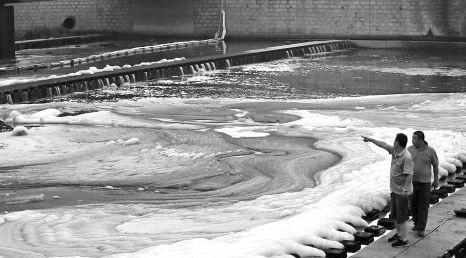 7月1日,工作人員查看通過市政污水管網排入鞍子河的原油情況。 新華社發
