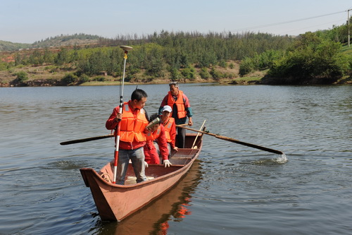 圖為測量人員正在人工湖上定點。向陽 攝
