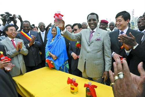 圖為投產(chǎn)儀式上,乍得總統(tǒng)代比高高舉起煉廠產(chǎn)品樣品。