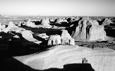 圖為夕陽下,位于克拉瑪依郊區的中國最美雅丹地貌魔鬼城吸引了眾多游客。