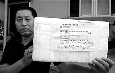 3.養殖戶展示采集扇貝的證據封簽,以作為將來索賠的證據。他們邀請天津一家海洋研究所的工程師和唐山市公證處工作人員共同采集了30箱這樣的證據。